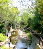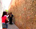 2.パブリックアートと人と街 ダウンタウンの中心部に、San Luis Creekという小川が流れている。緑豊かなその周辺は居心地良く整備されていて、カフェやレストラン、広場、ガ ーデンテラスなどがあり人々が思い思いの時間を過ごす場となっている。石や木で趣向を凝らした橋がいくつもかかり、川を上方から望むこともできる。川や小道沿いのあちこちに、面白い形の彫刻が設置されている。これは、サンルイオビスポ市の取り組みにより何人かの地元彫刻家がそれぞれ手がけた作品である。行政と芸術が自然と溶け合い市民の憩いの場を作り上げるのに成功した事例だろう。人があってのアートである。アートのある空間に、人が集まらなければ寂しい。 ![]() だいぶ種類は違うが、通り沿いの建物と建物の隙間に面白い空間がある。Bubble gum alleyと呼ばれ、1メートル程度の通路を挟み両側にそびえる壁一面に、噛んだあとのガムが色とりどりにびっしりと張り付けられている。ジャ クソン・ポロックがさらに厚みを増したような前衛アートに仕上がっている。地元高校の紺ジャンパーを着た一団がずんずん入っていくのでボランティアで撤去作業でもするのかな、と思ったら、みな一様に口から出したガムを新たに張っていた。市民参加型の壁画だ。街中いたるところにカフェがあるが、Mission Mallの裏手、川沿いの広場が ひときわ気持ちの良い空間となっていて、週末ともなるとパラソルを広げたガーデン席の小さな舞台で様々なコンサートが開かれる。その日は、ジャズのカルテットによる演奏だった。高々と繁る木々の間からの優しい日差しと、川辺を伝う涼やかな風にウッドベースとサックスの音色が解け込み、なんとも贅沢なひとときを過ごすことができた。ダウンタウンでは音楽もまた、 アートと同様パブリックな空間に溢れているようだった。通り沿いのレストランも戸口を開け放ったところが多く、メキシコ料理店ではマリアッチのギターが外まで流れてくるし、パブの窓からはロックの演奏がガンガン響いてくる。ホテル近くの寿司バーを覗くと、ダンステリアが出来上がっていて若い女性たちがダンスミュージックで踊っていたのがミスマッチで面白かった。![]() 歴史的建造物も多いダウンタウンでは、小さなテーマに特化した博物館や、古い様式の家を丸ごと公開した博物館などがあるのも特徴だ。 全米で最も古く、スペインからの入植の歴史をたどる博物館としては、今も礼拝や行事で人の集う1772年設立の教会Mission de Tolosaがある。当時の生活や農耕の歴史・文化を偲ばせる資料や道具類が展示され、ミュージアムショップも併設されている。私は家族の人数分、お守り代わりにとピューター製の小さなチャームを買った。 ふいに荘厳に鐘が打ち鳴らされ、礼拝堂の木戸が開いて着飾った人々がさざめきながらなだれ出てきた。結婚式だ。美しいドレス姿の花嫁は、教会の周辺と広場に集う人々の視線を一身に浴びる、煌びやかな最上級のパブリックアートだ。末永く、幸せに!