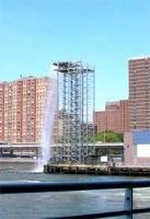 Eliassonはアーティストステイトメントの中で、「人間にとって必要不可欠な水が大自然の中で作り出す現象である滝を、あえてニューヨークビル群を背景とする“建築(構築)物”として再現させた。それにより、誰もが渇望する大自然を都会に居ながらにして体験し、各々が環境を考える機会になる」と記している。4ヶ所の滝は橋の下、川岸に近いものとがあり、ごく普通のビルの建材(足場、ポンプ、パイプ)などで水の循環を作り出している。 それぞれに周りの都会光景とマッチしているが、川面からひときわ高くそびえる足場の先端から落ちる滝は、人工的な建材ががっしり堂々と透けて見えるがゆえに、わざわざ遊具を頑丈に作ってくれた ような楽しさがある。水のある光景を人は常に夢みる。人工的なプールやせせらぎ、大海や、大自然の川や湖ならなおのこと。 体内でも体外でも、人間は水を必要としているのだ。 真夏のNYは冗談抜きで水のボトルなしには歩けない。船上で、雄大な滝の姿を見、音を聞きながらミネラルウォーターをごくごく飲む。 滝を飲んでいるような気がした。 |