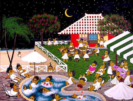 A casual party at the pool side in the night.People get together to join the circle.They are talking,laughing, and dabbling in water.