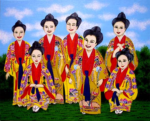is diffierent from other place in Japan. Mostly the okinawan cultures are based on Chinese cultures . We could find the special colors,desighes on this beautiful southern island Okinawa. The Ryukyu's Kimono is known as the most beautiful dress in okinawa. Nowaday, we also enjoy to wear these special kimonos at the cultural festivals as costumes. The young lady selected as a princess of the festival sometimes wear those kimonos with honor. The middle aged women look also great in these kimonos. Okinawan kimono, most suitable for okinawan ladies,we believe. |