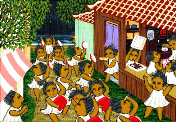 | 旧盆にこの世に里帰りしたご先祖を慰めお送りする儀式・エイサー。パーランクーを鳴らす独特な踊りは壮大なスケール。全島エイサー大会は県内各地のエイサー隊が形を競うビッグイベントとして盛り上がる。 沖縄では保育園や幼稚園に通う頃からエイサー演舞を習うので体が自然に覚えている。その振り付けはなかなか忘れない。 今いっせいに「ミルクムナリ」を踊れと言われたら、大半の若者が踊れるのではないかしら? |