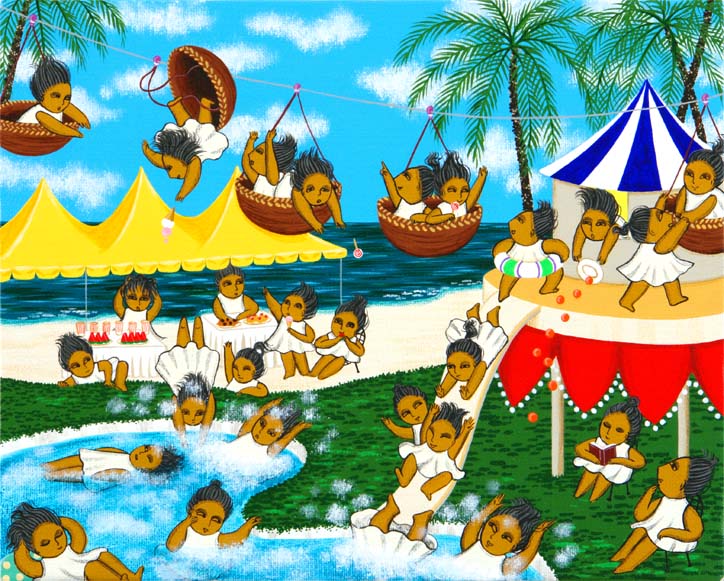 ゴンドラというとイメージするのはバブル期に流行った結婚式。新郎新婦がドライアイスとレーザー光線に包まれながらゆっくりと着地するあの装置。 世の中の激変とともに若者の意識も変化し、結婚式も派手さよりも心のこもったものがすっかり浸透した昨今。 地味ながらも大切なものを見極める様は頼もしく、ゴンドラなど使わずともぐらつくことなく地に足をつけることができる堅実さを感じる。 5月の沖縄は梅雨。ジメジメした天気が続くけれど気温はすでに夏。雨にぬれるついでに仲間でビーチに繰り出すのも若者の特権。 日焼けもさけられるし、案外良いレジャーかもしれない。たくさん楽しんでほしい。 |